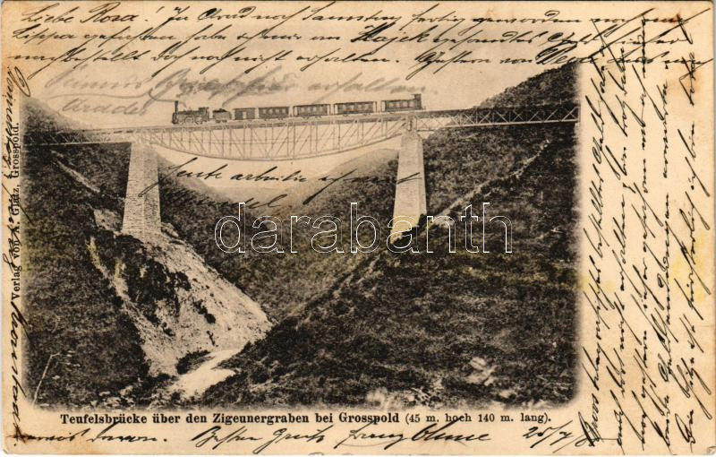 1905 Nagyapold, Grosspold; Ördög-vasúti híd a Cigány-árok felett, gőzmozdony, vonat. A. Glatz kiadása / Teufelsbrücke über den Zigeunergraben / railway bridge, viaduct, locomotive, train