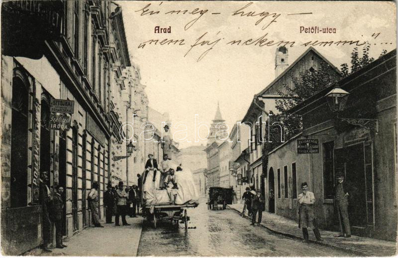 1912 Arad, Petőfi utca, Elsőrendű arany és ezüst ékszerműhely, A Sztojkai ásványvíz főraktára és szállítási iroda, megpakolt szekéren pózoló munkások / jewelry workshop, mineral water main warehouse and transport office, fully loaded cart (EK)