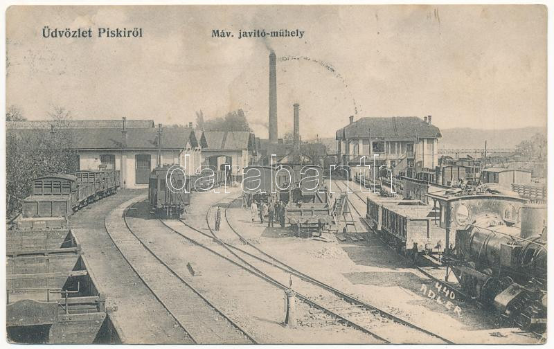 1912 Piski, Simeria; MÁV javító műhelye, gyár vasútállomásnál. Adler fényirda 440. / repair workshop of the Hungarian State Railways with trains (factory), railway station