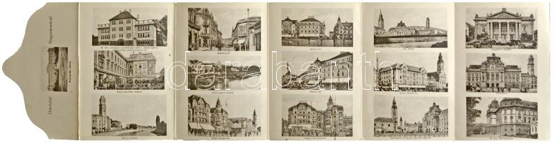 1915 Nagyvárad, Oradea; 6-részes kinyitható képeslap 5 képeslappal: Csendőrségi iskola, Royal kávéház, Fekete Sas szálloda, Bémer tér, utcák, tövényszék, városháza, színhéz és autók / 6-tiled folding postcard with 5 postcards: gendarme school, cafe, Cris river, streets, squares, theatre, town hall, court, churches (hajtsánál szakadt / bent til broken)