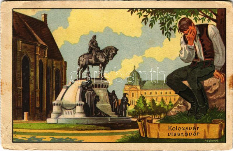 1939 Kolozsvár, Cluj; "Kolozsvár visszavár", Mátyás szobor. Kiadja a Székely Egyetemi és Főiskolai Hallgatók Egyesülete / Hungarian irredenta art postcard, Matthias Corvinus, Mathias Rex statue s: Gebhardt - (képeslapfüzetből / from postcard booklet) (EB)
