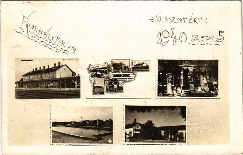 1940 Érmihályfalva, Valea lui Mihai; Visszatért! vasútállomás, strand, Cultura kiadó és nyomda üzlete / for the memory of the entry of the Hungarian troops, railway station, swimming pool, book printing shop (ragasztónyom / gluemark)