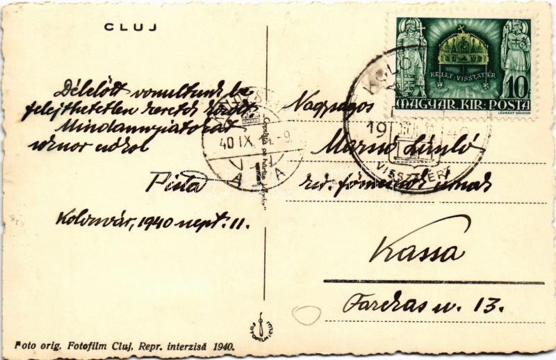 Beschreibung: 1940 Kolozsvár, Cluj; Internatul liceului reformat / Református internátus / Calvinist boarding school + "1940 Kolozsvár visszatért" So. Stpl