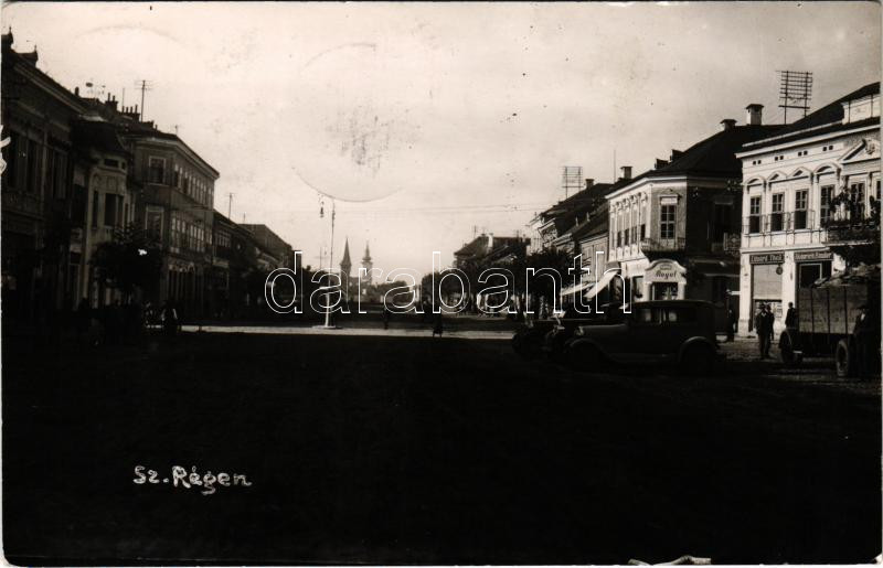 1940 Szászrégen, Reghin; utca, autók, teherautó, Heinrich Binder, Eduard Theil üzlete, Royal kávéház és cukrászda / street, automobile, truck, shops, cafe and confectionery. photo + "1940 Szászrégen visszatért" So. Stpl