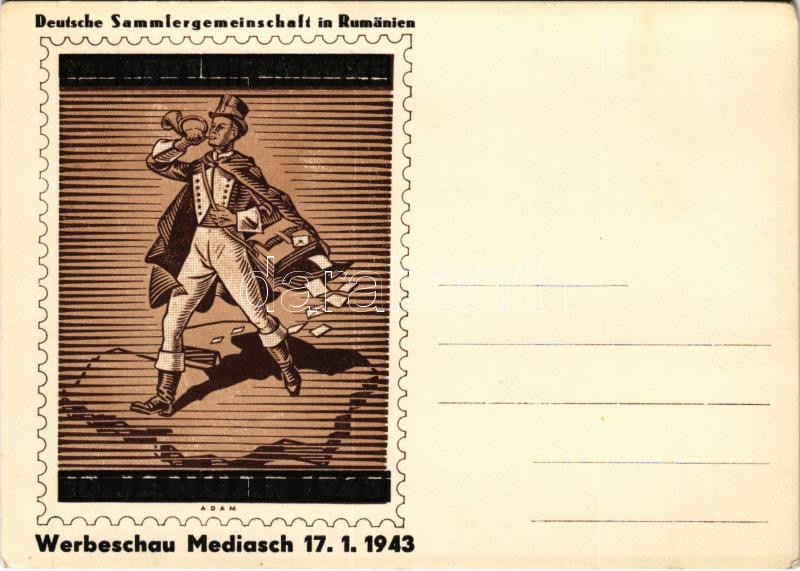 1943 Medgyes, Mediasch, Medias; Deutsche Sammlergemeinschaft in Rumänien, Tag der Briefmarke Werbeschau / Német bélyeggyűjtők Romániában reklám / German stamp collectors in Romania, advertisement