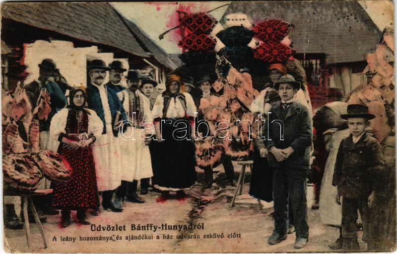 1944 Bánffyhunyad, Huedin; A leány hozománya és ajándékai a ház udvarán az esküvő előtt. Mocsáry Kálmán kiadása / Transylvanian folklore, before the wedding, the bride's dowry and presents (EK)