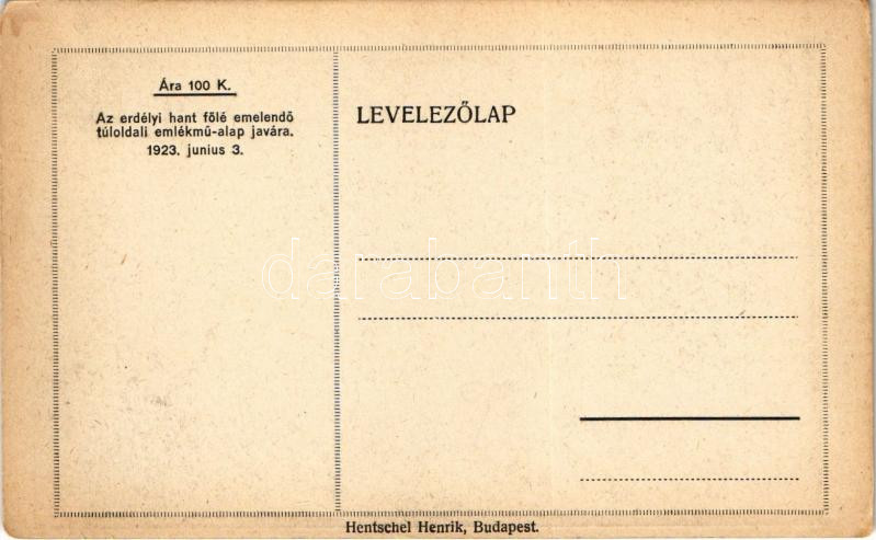 Erdélyi hant fölé emelendő túloldali emlékmű-alap javára 1923. június 3. Istók János turul szobor terve. Hentschel Henrik kiadása / Charity card for a Trasylvanian turul monument by Istók János. Hungarian irredenta (kopott sarkak / worn corners)