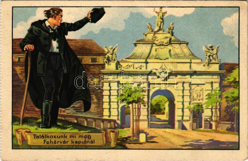 Gyulafehérvár, Karlsburg, Alba Iulia; "Találkozunk mi még Fehérvár kapuinál", Alsó várkapu. Kiadja a Székely Egyetemi és Főiskolai Hallgatók Egyesülete / Hungarian irredenta propaganda art postcard, castle's lower gate s: Gebhardt
