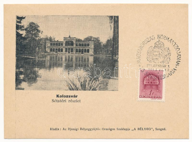 Beschreibung: Kolozsvár, Cluj; Sétatéri kioszk. Kiadja az Ifjúsági Bélyeggyűjtők Országos Szaklapja "A Bélyeg" / promenade kiosk + "1943 Kolozsvár Magyarország Kormányzójának 15. Születésnapja" So. Stpl. (non PC)
