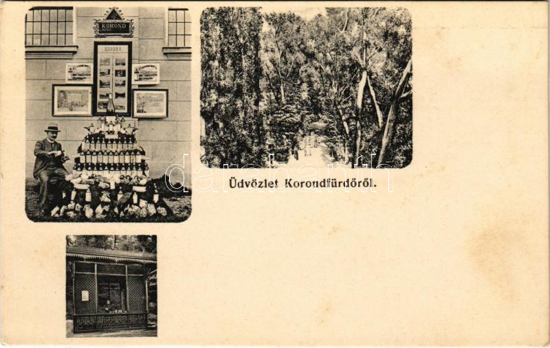 Beschreibung: Korond, Corund; Üdvözlet Korondfürdőről. Klimatikus gyógyhely. Sós-, szénsavas-, vasas-fürdők; ásványvíz- és tejkúra; belégzési gyógymód / spa, bath, mineral water (fl)