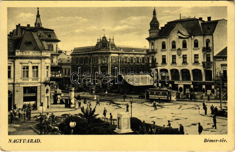 Nagyvárad, Oradea; Bémer tér, villamos, Pesti Magyar Kereskedelmi Bank, Általános Hitelbank, útépítés. Hátoldalon "Látogassuk Nagyváradot!" turisztikai reklám / square, tram, shops, bank, road construction (EK)