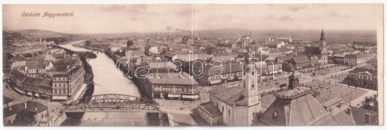 Beschreibung: Nagyvárad, Oradea; látkép zsinagógával. Boros Jenő kiadása. 2-részes kihajtható panorámalap / 2-tiled folding panoramacard with synagogue (EK)