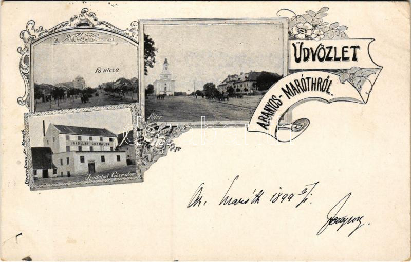1899 (Vorläufer) Aranyosmarót, Zlaté Moravce; Fő utca és tér, Uradalmi gőzmalom. Steiner Samu kiadása / main square and street, mill. Art Nouveau, floral (EK)