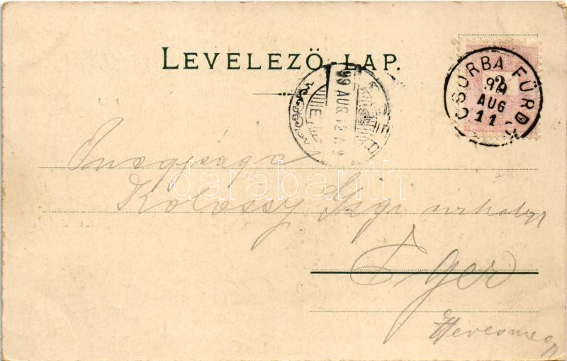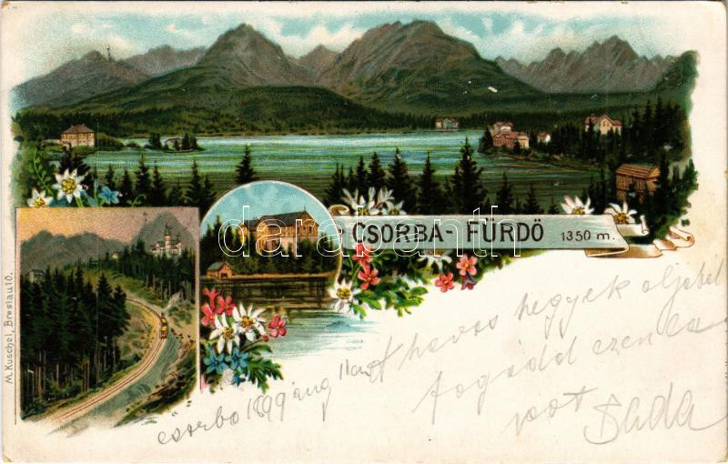 1899 (Vorläufer) Tátra, Magas-Tátra, Vysoké Tatry; Csorba-tó, Csorba-fürdő, fogaskerekű vasút / Strbské pleso / Csorba am See / lake, cogwheel railway, train. M. Kuschel. Art Nouveau, floral, litho (EK)