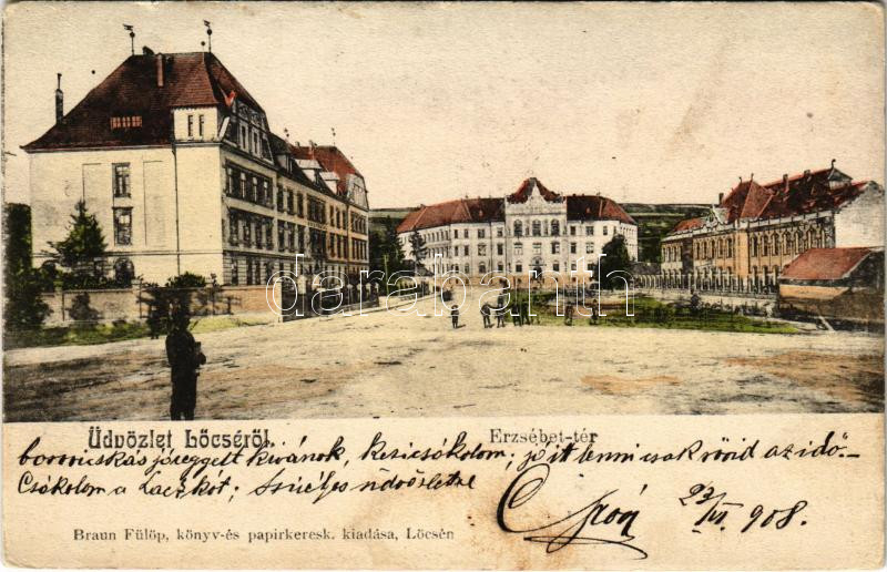 1908 Lőcse, Levoca; Erzsébet tér, Törvényszéki palota. Braun Fülöp kia... https://www.darabanth.com/de/436-Fernauktion/436.0/Ansichtskarten/Slowakei~2000006/1908-Locse-Levoca-Erzsebet-ter-Torvenyszeki-palota-Braun-Fulop-kiadasa-square-court-~II2832822
