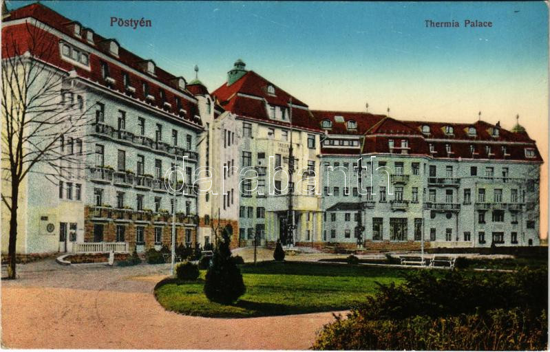 1917 Pöstyén, Piestany; Thermia Palace szálló. Vasúti levelezőlapárusí... https://www.darabanth.com/de/436-Fernauktion/436.0/Ansichtskarten/Slowakei~2000006/1917-Postyen-Piestany-Thermia-Palace-szallo-Vasuti-levelezolaparusitas-63-1915-hotel~II2828891