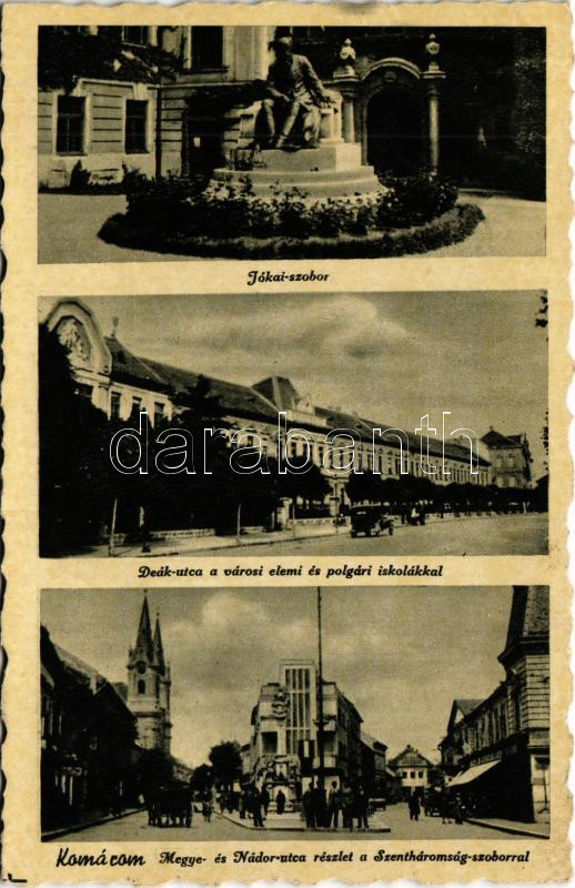 Komárom, Komárno; Jókai szobor, Deák utca, Városi elemi iskola, Polgári iskola, Megye és Nádor utca, Szentháromság szobor, üzletek / statue, street view, schools, shops, Holy Trinity statue (EK)