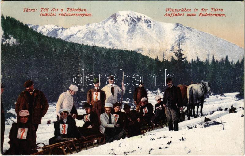 Tátra, Vysoké Tatry; Téli élet, indulás a ródliversenyhez. Cattarino S. utóda Földes Samu kiadása, Dr. Guhr felvétele / Winterleben, Auffahrt zum Rodelrennen / winter sport, start at the sleigh race