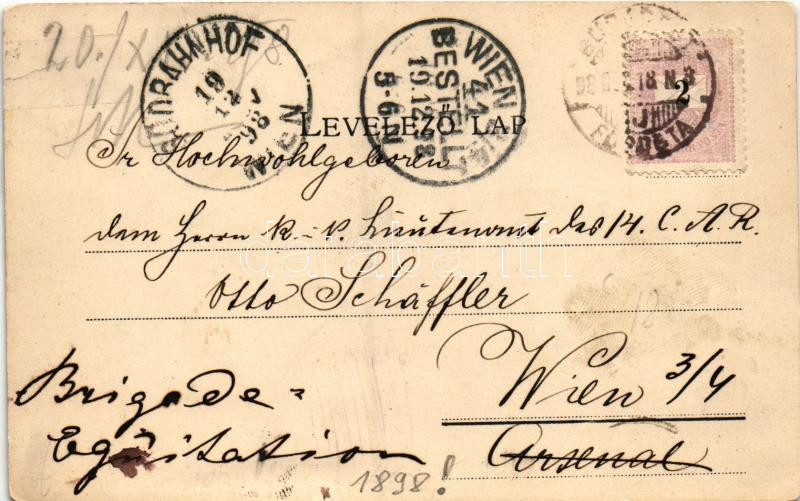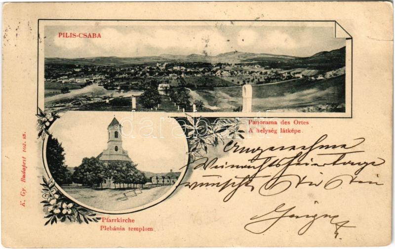 Beschreibung: 1898 (Vorläufer) Piliscsaba, látkép, plébániatemplom. K. Gy. 102. sz. Art Nouveau, floral (r)