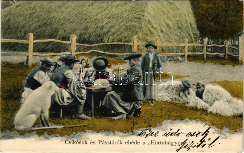 1908 Hortobágy, Csikósok és pásztorok ebéd a Hortobágyon, kutya, magya... https://www.darabanth.com/de/436-Fernauktion/436.0/Ansichtskarten/Ungarn~2000004/1908-Hortobagy-Csikosok-es-pasztorok-ebed-a-Hortobagyon-kutya-magyar-folklor-EK~II2827926