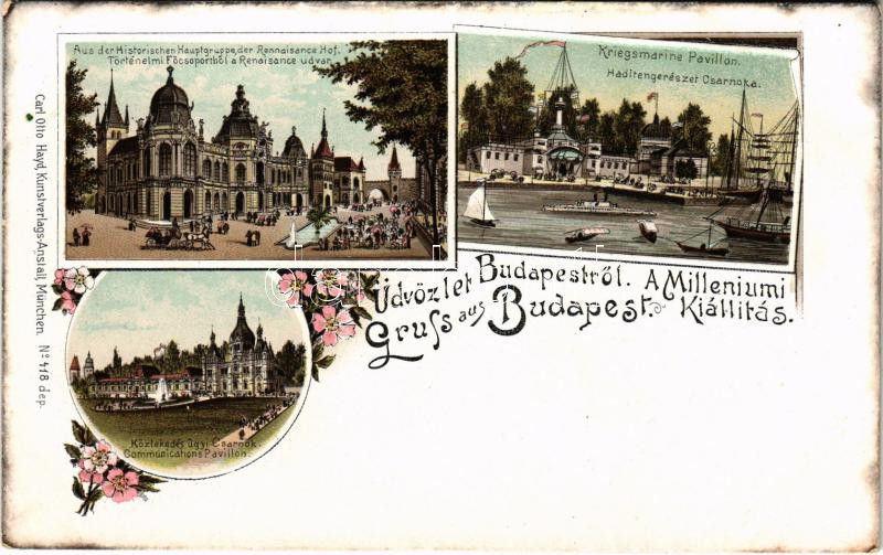 Budapest, Üdvözlet a Milleniumi (Ezredéves) Kiállításról, Közlekedésügyi és haditengerészeti csarnok, Történelmi főcsoport és Renaisance udvar. Carl Otto Hayd No. 418. Art Nouveau, floral, litho
