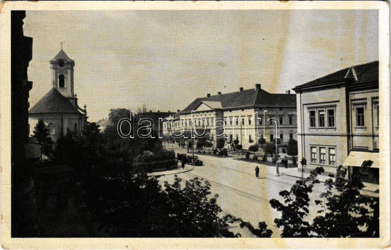 Beschreibung: 1936 Nagykikinda, Kikinda; Okruzni sud i Pravoslavna crkva / Járásbíróság és ortodox templom, automobil / district court, Orthodox church, automobile (fl)
