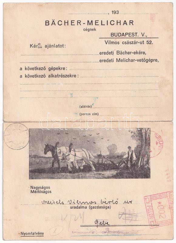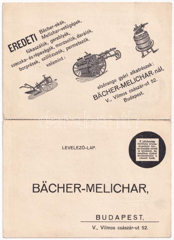 Bächer-Melichar eke és vetőgép gyár kinyitható reklámlapja. Budapest, ... https://www.darabanth.com/de/436-Fernauktion/436.0/Ansichtskarten/Werbungen~2000048/Bacher-Melichar-eke-es-vetogep-gyar-kinyithato-reklamlapja-Budapest-Vilmos-csaszar-ut-52~II2833423