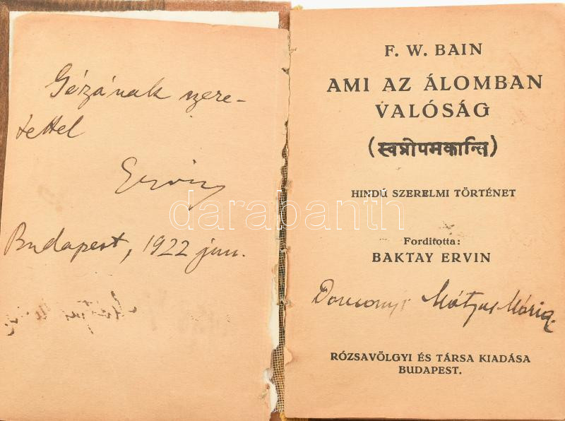 F. W. Bain: Ami az álomban valóság. Hindu szerelmi történet, fordította: Baktay Ervin, Bp., 1922, Rózsavölgyi és Társa, Sérült laza félvászon kötésben címlap kijár