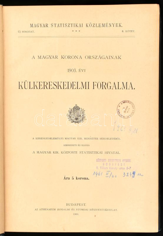 A Magyar Korona Országainak 1903. évi külkereskedelmi forgalma. Bp., 1... https://www.darabanth.com/de/436-Fernauktion/436.0/Bucher/Bucher-Geschichte~1000009/A-Magyar-Korona-Orszagainak-1903-evi-kulkereskedelmi-forgalma-Bp-1904-KSH-325p-Kiadoi-egC3~II2834007