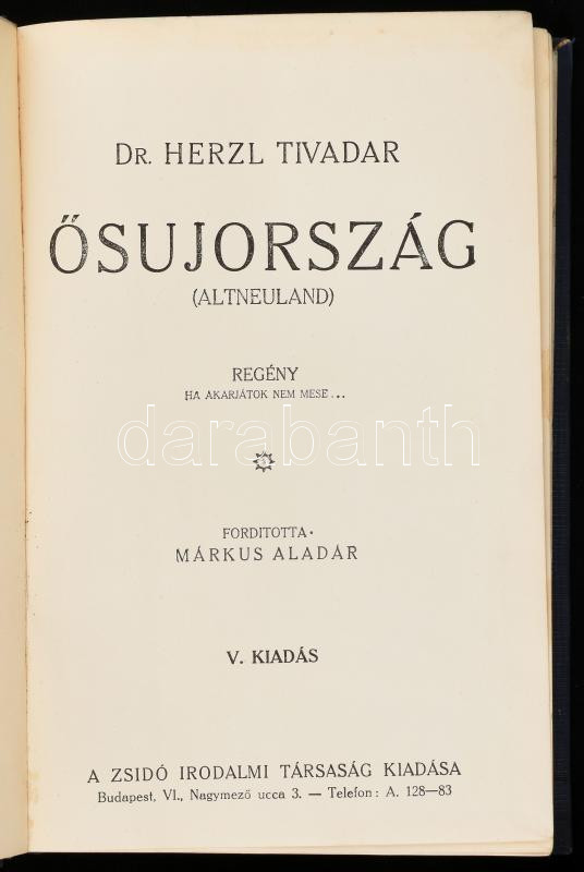 Herzl Tivadar: Ősujország. (Altneuland.) Regény. Ford.: Márkus Aladár.... https://www.darabanth.com/de/436-Fernauktion/436.0/Bucher/Bucher-Judaica~1000018/Herzl-Tivadar-Osujorszag-Altneuland-Regeny-Ford-Markus-Aladar-Bp-1929-Zsido-Irod~II2832319