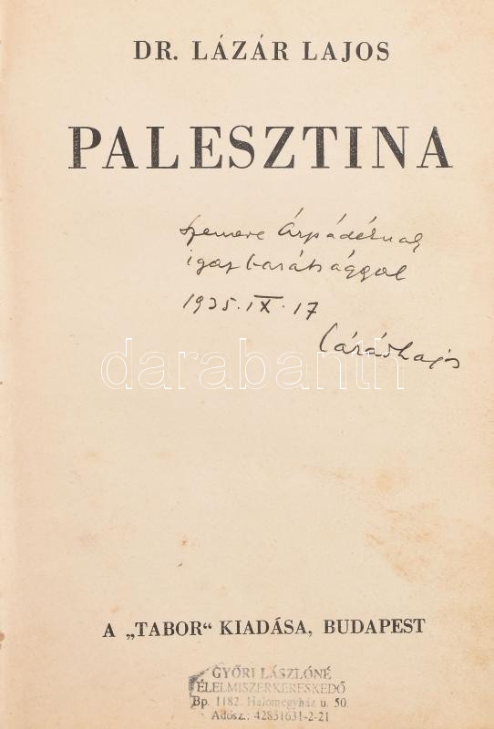 Lázár János: Palesztina. DEDIKÁLT. Bp., én., Tabor, 180 p. Kiadói egészvászon-kötés, sérült borítóval, sérült gerinccel, hiányos, a hátsó szennylap és az utolsó két lap hiányzik, rossz állapotban.