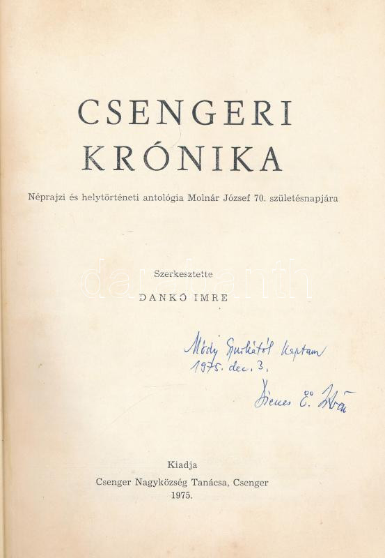 Csengeri krónika. Néprajzi és helytörténeti antológia Molnár József 70... https://www.darabanth.com/de/436-Fernauktion/436.0/Bucher/Bucher-Reise-und-Ortgeschichte~1000005/Csengeri-kronika-Neprajzi-es-helytorteneti-antologia-Molnar-Jozsef-70-szuletesnapjara-~II2826071
