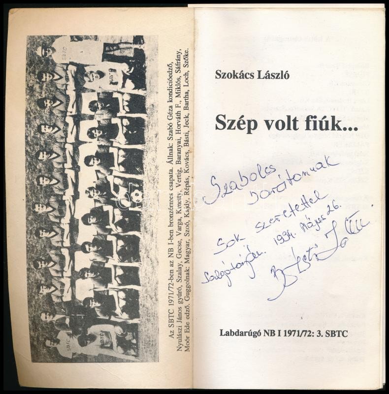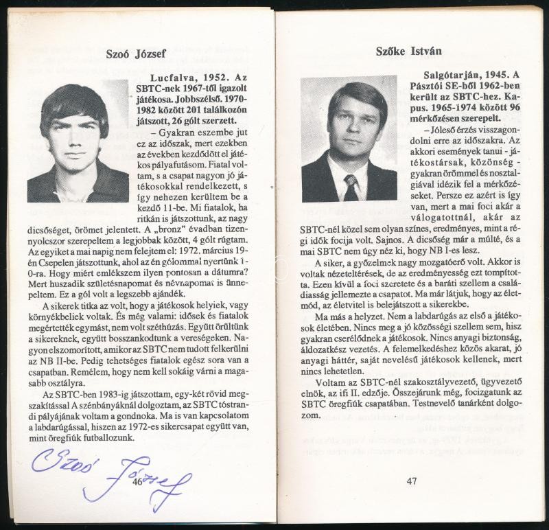 Szokács László: Szép volt fiúk... Labdarúgó NB I 1971/72: 3. SBTC. Salgótarján, 1994, SBTC Öregfiúk Alapítvány. Fekete-fehér fotókkal illusztrált. Kiadói papírkötés, kissé kopott borítóval, kijáró lapokkal. Básti István (1944- ) és Szoó József (1952-2011) labdarúgók, a Salgótarjáni BTC volt játékosainak dedikációjával ill. aláírásával.