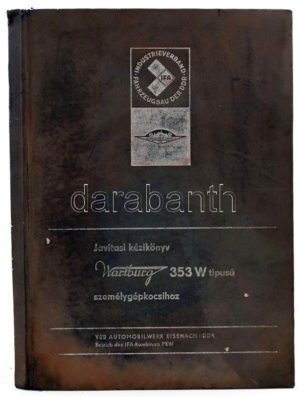 Javítási kézikönyv Wartburg 353 W típusú személygépkocsihoz. Eseinach,1979, VEB Automobilwerk. 2. kiadás. Kiadói nylon-kötés, kopott, foltos borítóval, sérült gerinccel és a borítón kis sérülésnyomokkal.