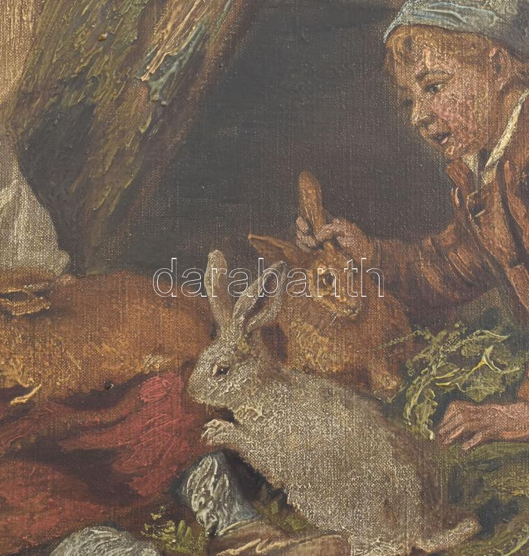 Jelzés nélkül, feltehetően 1900 körül működött német festő: Nyuszi etetők. 2db. Olaj, vászon, minimális sérüléssel, keretben, 27x58 cm