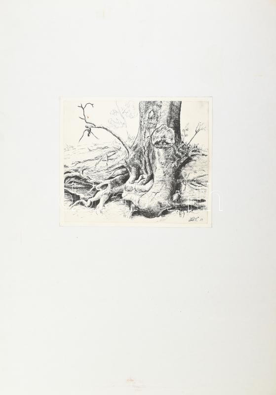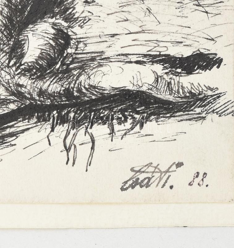 Beschreibung: Olvashatatlan (Csáti?) jelzéssel: Girbe-gurba. Tus, papír, kartonra kasírozva. 21×25 cm