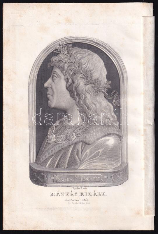 1855 Tyroler József (1822-1854): Rex Mathias Hungariae Mátyás Király, acélmetszet, papír, jelzett a nyomaton, Pest, Tyroler-ny., védő hártyapapírral, a felületén kis foltokkal, 21x14 cm