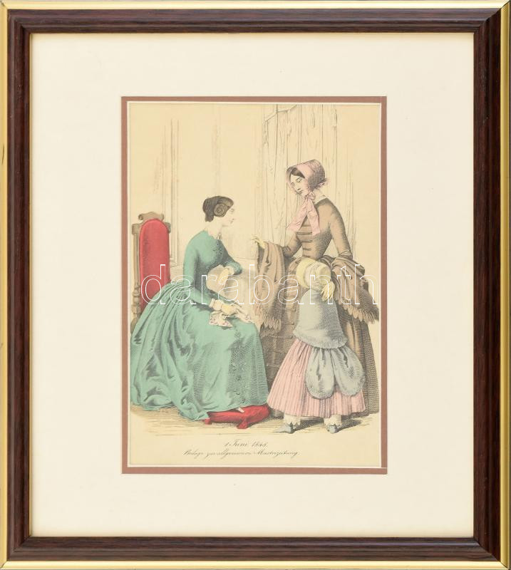 Beschreibung: Biedermeier divatkép (1. Juni 1848, Beilage zur allgemeine Musterzeitung. Színezzett metszet, papír. Dekoratív, üvegezett fakeretben. 19×13 cm