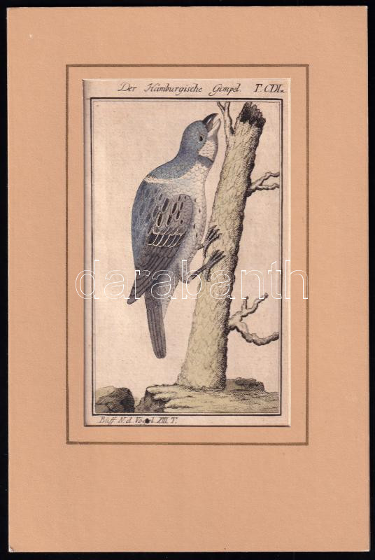 cca 1790-1800 Der Hamburgische Gimpel (énekesmadár). Büff[on] Naturh[istorie] d[er] Vögel. Táblakép Buffon Histoire naturelle des oiseaux egy német nyelvű fordításából. Kézzel színezett rézmetszet paszpartuban / Coloured copper engraving, 14x8 cm