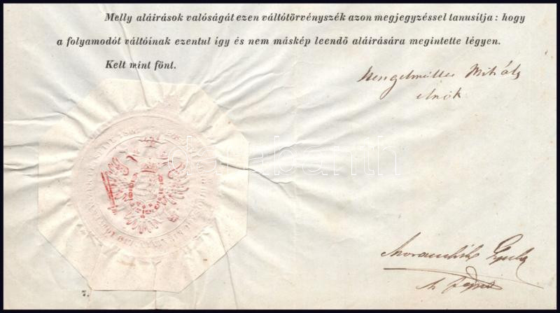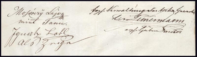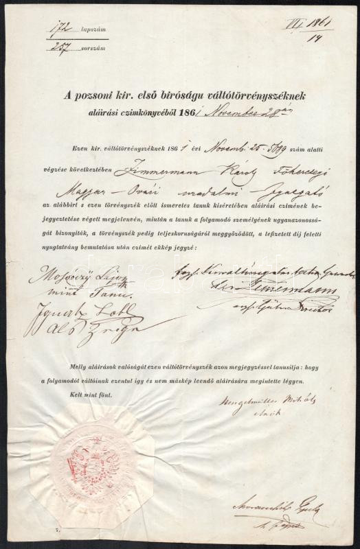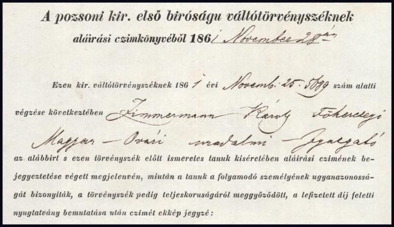 1861 Főhercegi, magyaróvári uradalmi igazgató aláírási címpéldánya, pozsonyi kir. első bíróság váltótörvényszék okmánya, magyar nyelven, papírfelzettel, hajtásnyomokkal, apró lapszéli szakadásokkal