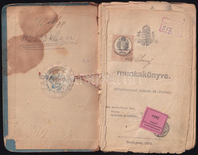 1888-1936 Munkakönyv baracskai szül. betűszedő (nyomdász) részére, számos bejegyzéssel és bélyegzővle, klf. városok (Szolnok, Bp.) és nyomdák (Athenaeum, Bakos István megyei könyvnyomdája Szolnok), sérült