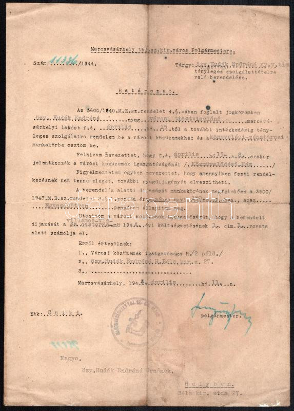 Beschreibung: 1944 Marosvásárhely polgármestere (Májay Ferenc) által kiadott kinevezés