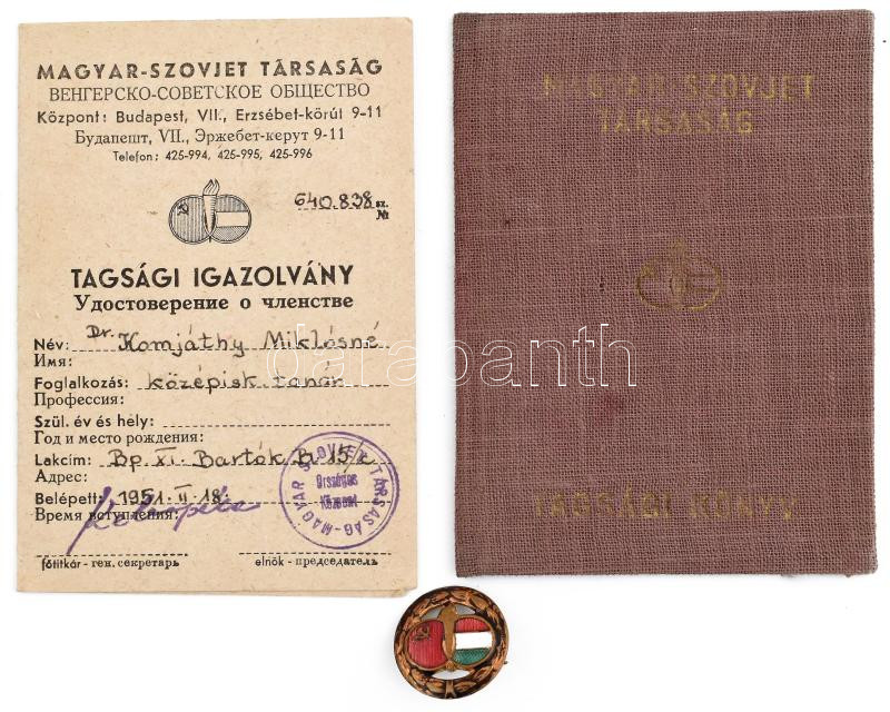1951-1952 Magyar-Szovjet Társaság tagsági igazolvány és könyv + fém ki... https://www.darabanth.com/de/436-Fernauktion/436.0/Kunst-Dokumente-andere-Sammelgebiete/Dokument~500018/1951-1952-Magyar-Szovjet-Tarsasag-tagsagi-igazolvany-es-konyv-plus-fem-kituzo-jelveny-d-20-~II2831661