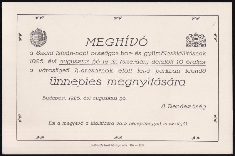 1926 Bp., meghívó a Szent István-napi országos bor- és gyümölcskiállít... https://www.darabanth.com/de/436-Fernauktion/436.0/Kunst-Dokumente-andere-Sammelgebiete/Drucksachen~1000003/1926-Bp-meghivo-a-Szent-Istvan-napi-orszagos-bor-es-gyumolcskiallitas-megnyitasara-j~II2825203