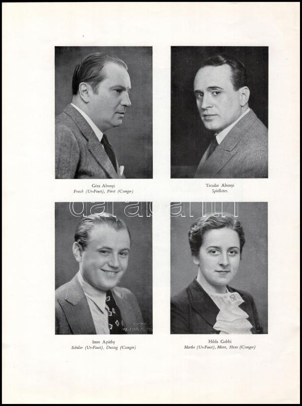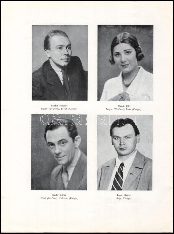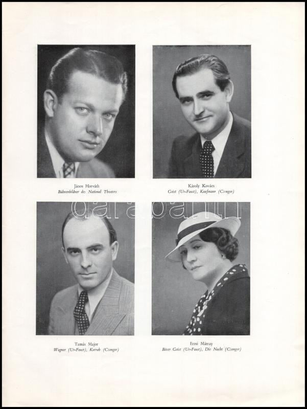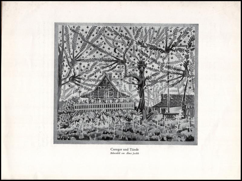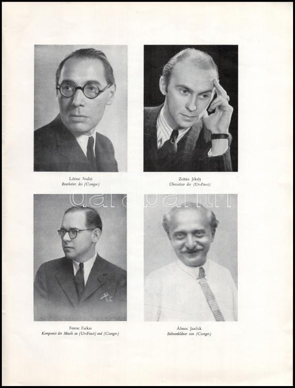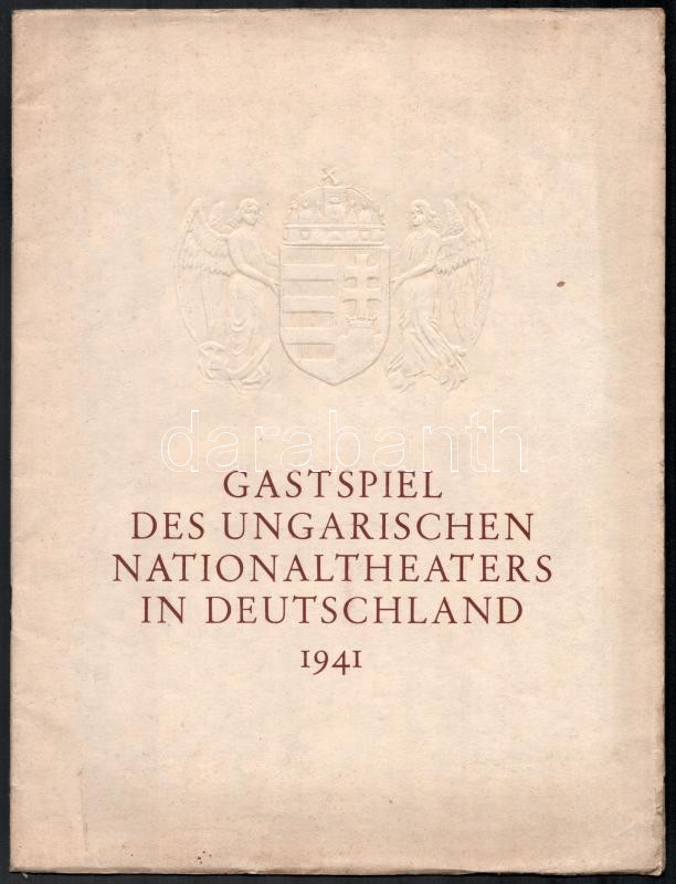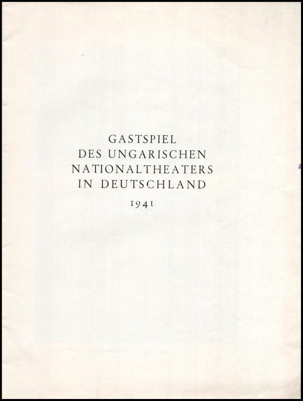 1941 Gastspiel des Ungarischen Nationaltheaters in Deutschland. Bp., 1941., Königl. Ungarische Universitäts-Druckerei, 30+1 p. Német nyelven. Gazdag fekete-fehér képanyaggal illusztrált, rajta Major Tamás, Pethes Sándor, Tímár József, Uray Tivadar, Gobbi Hilda, Szörényi Éva, Németh Antal, Szabó Lőrinc, Jaschik Álmos és mások. Kiadói angyalos-koronás nemzeti kiscímerrel illusztrált papírkötés, kis kopásnyomokkal.