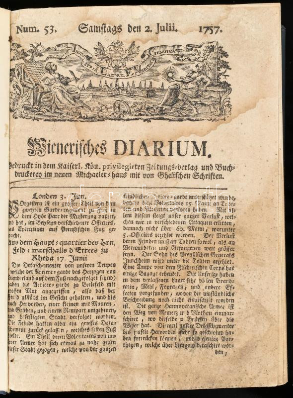 Wienerisches Diarium, von Staats, vermischten und gelehrten Neuigkeiten. 1757, Nr 53--105. (teljes második félév. Ghelensche Erben,, Wien, Modern vászonkötésben
