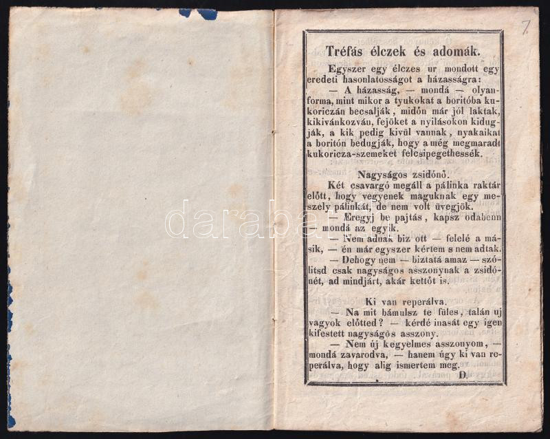cca 1850-1870 Tréfás élczek és adomák. nyn., én., ceruzás számozással,... https://www.darabanth.com/de/436-Fernauktion/436.0/Kunst-Dokumente-andere-Sammelgebiete/Drucksachen~1000003/cca-1850-1870-Trefas-elczek-es-adomak-nyn-en-ceruzas-szamozassal-kisse-foltos-lapok~II2829012