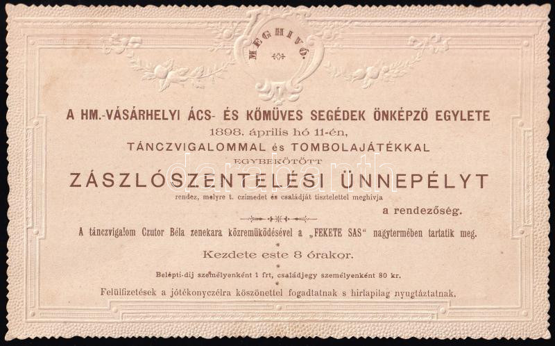 Beschreibung: cca 1890 A Hódmezővásárhelyi Ács- és Kőműves Segédek Önképző Egylete zászlószentelésre szóló dombornyomott meghívó 17x11 cm