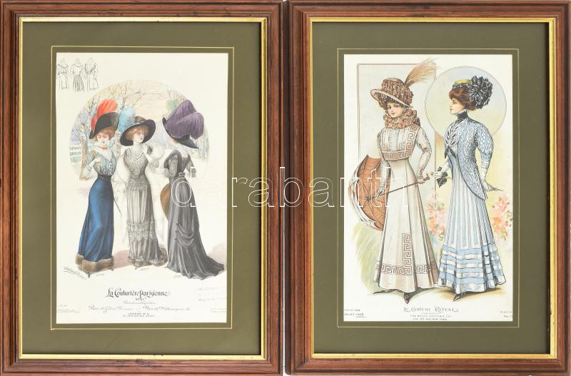 cca 1908 2 db színes női divatkép (Le Costume Royal és La Couturiére Parisienne). Nyomat, papír. 40x24 cm. Dekoratív, üvegezett fakeretben. Utóbbi kissé foltos.
