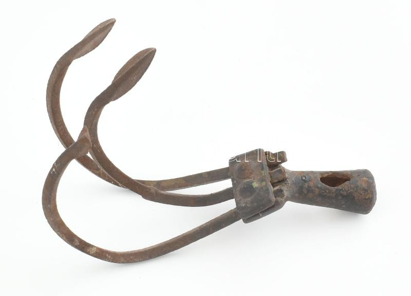 Beschreibung: Régi kerti, mezőgazdasági szerszám, kézi kultivátor gabonavetéshez. Kissé sérült, rozsdás, nyél nélkül, h: 22 cm